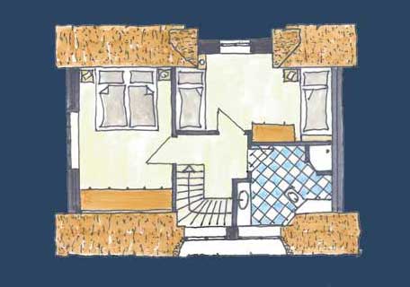 Im OG liegen die beiden gemütlichen, hellen Schlafzimmer mit großzügigen Einbauschränken. Ein Schlafzimmer hat ein Doppelbett (zwei Matratzen à 90cm) und das zweite hat zwei einzelne Betten à 90cm. Im OG liegt zudem das Duschbad mit einem weiteren WC.